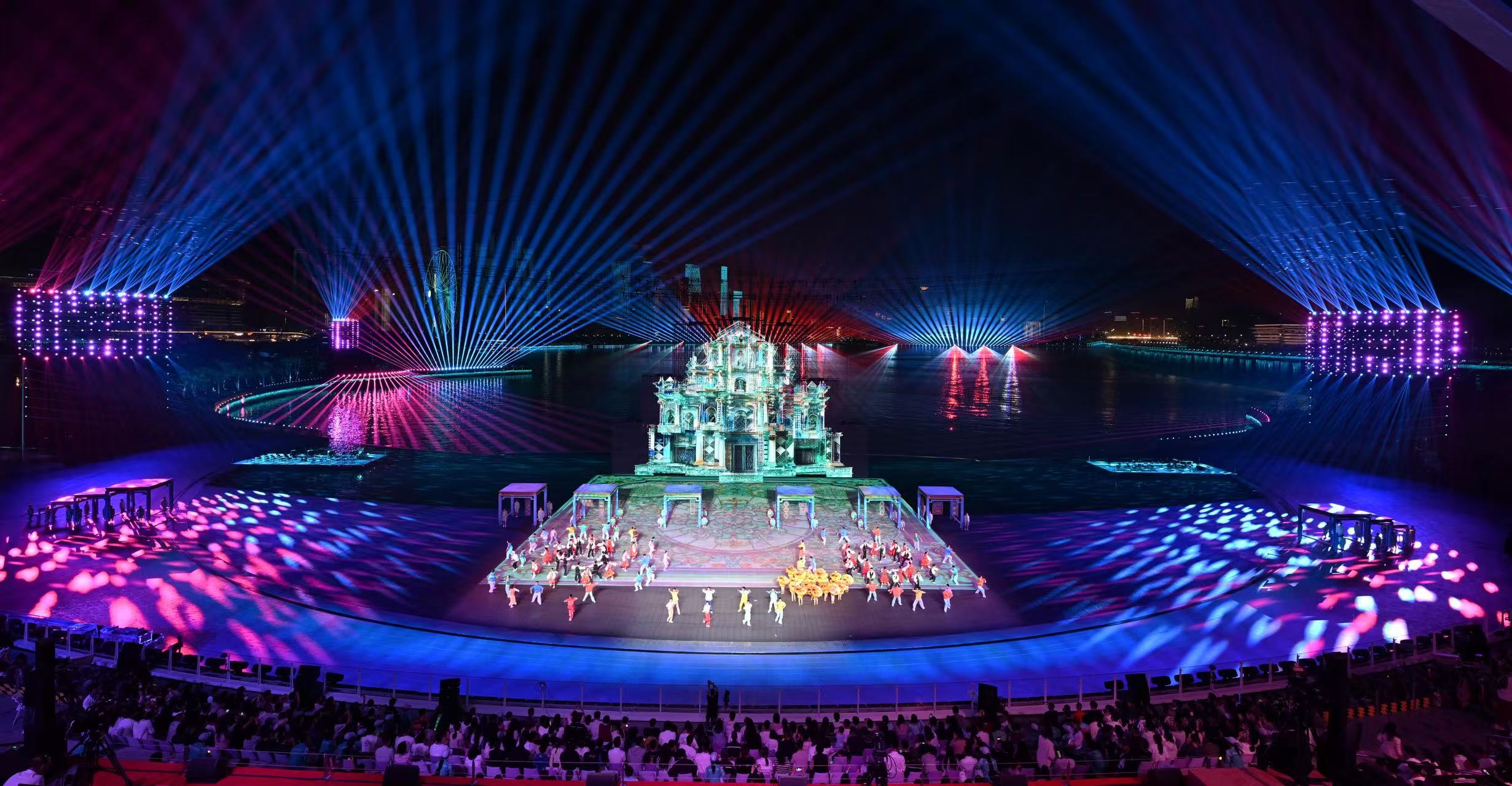 舞台最大的亮点之一,就是创新性地将陆域看台、水域舞台与城市背景融为一体,打造出名副其实的“城市全景闭幕式”。而灯光则成为串联这一切的“点睛之笔”,它将不同元素巧妙结合,最终构成了这场震撼全场的视觉盛宴。